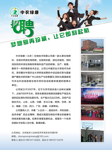 中农绿康(北京)生物技术有限公司是一家从事生物肥料、生物农药、微生物药肥、生物有机肥、微生态制剂、饲料添加剂和环保生物制剂等高科技产品的研制、生产、销售、服务于一体的高新技术企业,公司以中国农业大学技术为依托,承担着对中国农业大学研发成果的中试试验任务与国家增产菌技术研究推广中心的生产与经营重任,同时也是国家现代农业科技城首都生物农药科技创新服务联盟的理事长单位。