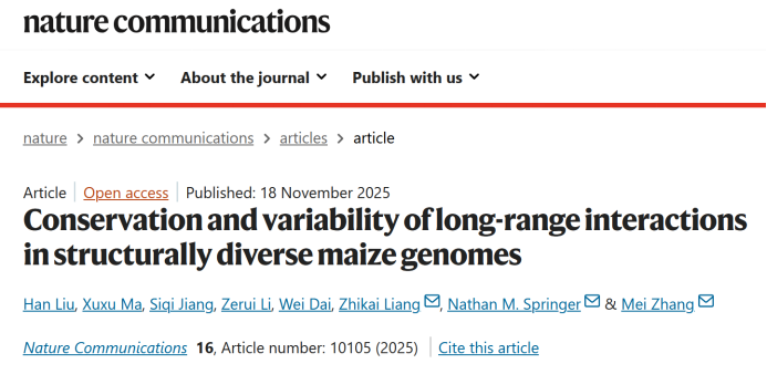 11月18日,我院青贮玉米团队教师刘函在国际著名期刊Nature Communications杂志(2025年影响因子15.7),发表《Conservation and Variability of Long-range Interactions in Structurally Diverse Maize Genomes》研究论文。